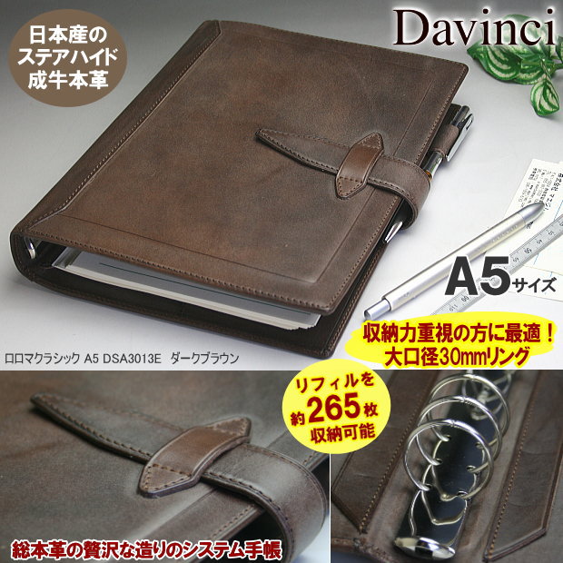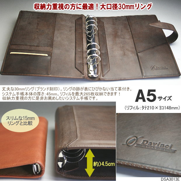 ダ・ヴィンチグランテ 本革濃茶 A5システム手帳 大口径30ミリリング