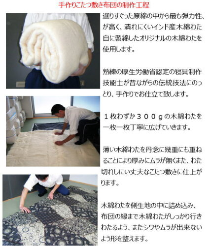 従来のこたつ敷き布団よりも沢山の木綿わたを充填するため、たっぷりとしたボリュームがあり、約10cmもの厚みがあります。