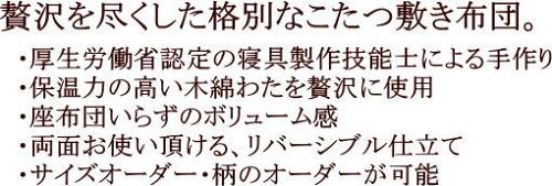 紬調 こたつ敷布団 サイズ:220×320cm 中身:木綿わた95% ポリエステル5% 充填量:13,6kg 側生地:綿100% 紬調 日本製 製造販売:合資会社丹後屋商店 製作:厚生労働省認定寝具製作技能士 田中啓之 適合カバーサイズ:225×325cm 取り扱いやすいよう薄く作ってほしい。